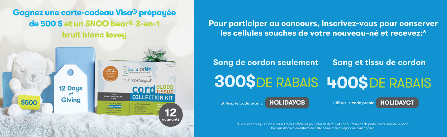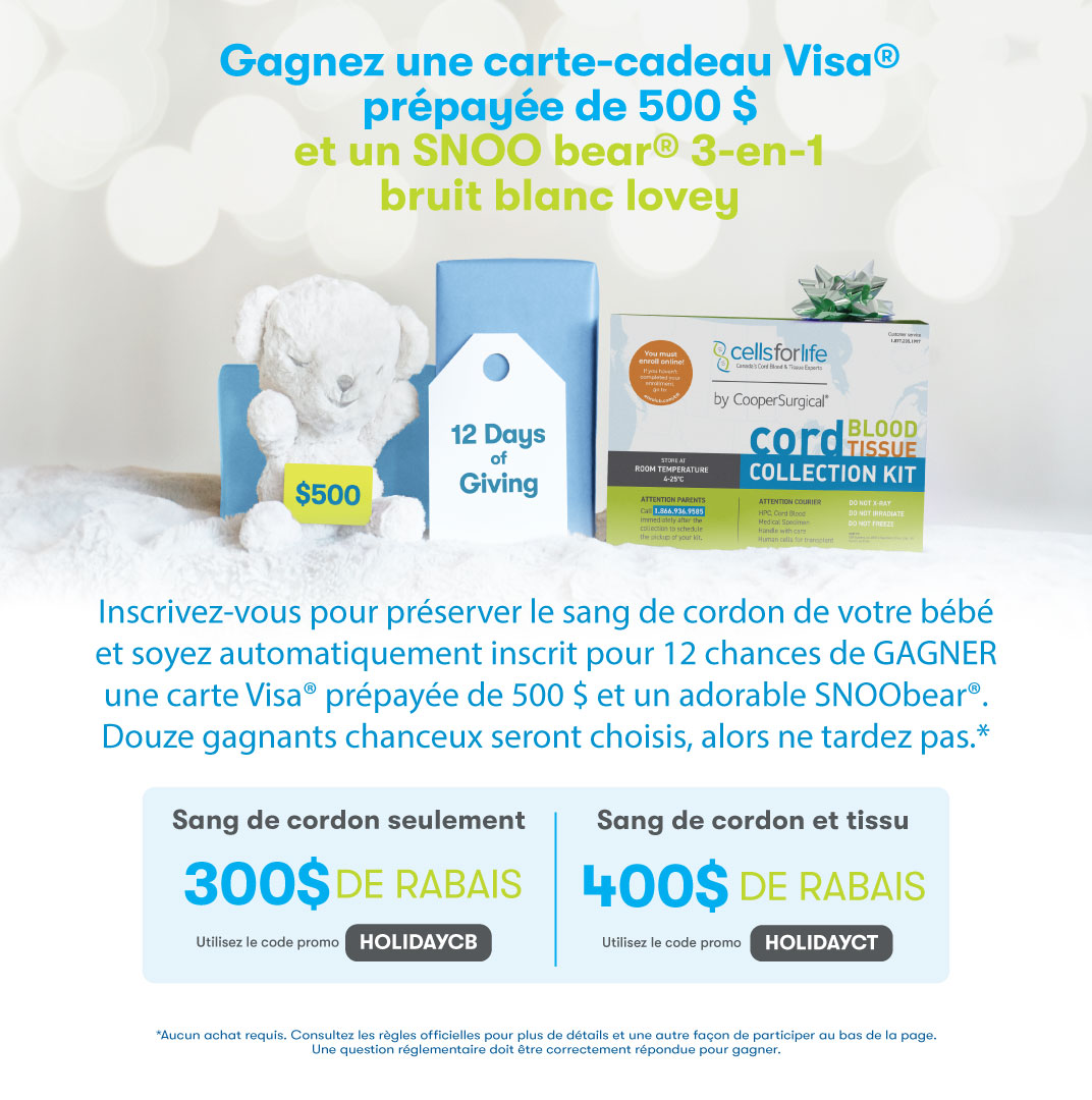 *Voir le règlement officiel du 12 jours de cadeaux-concours ici . Réservé aux résidents canadiens âgés de 18 ans et plus. Nul là où la loi l’interdit. SNOO® et SNOObear® sont des marques déposées de Happiest Baby, Inc. Happiest Baby n’est pas impliquée dans cette promotion et ne l’a pas approuvée. Visa® est une marque déposée de Visa Inc. Visa n’est pas impliquée dans cette promotion et ne l’a pas approuvée.